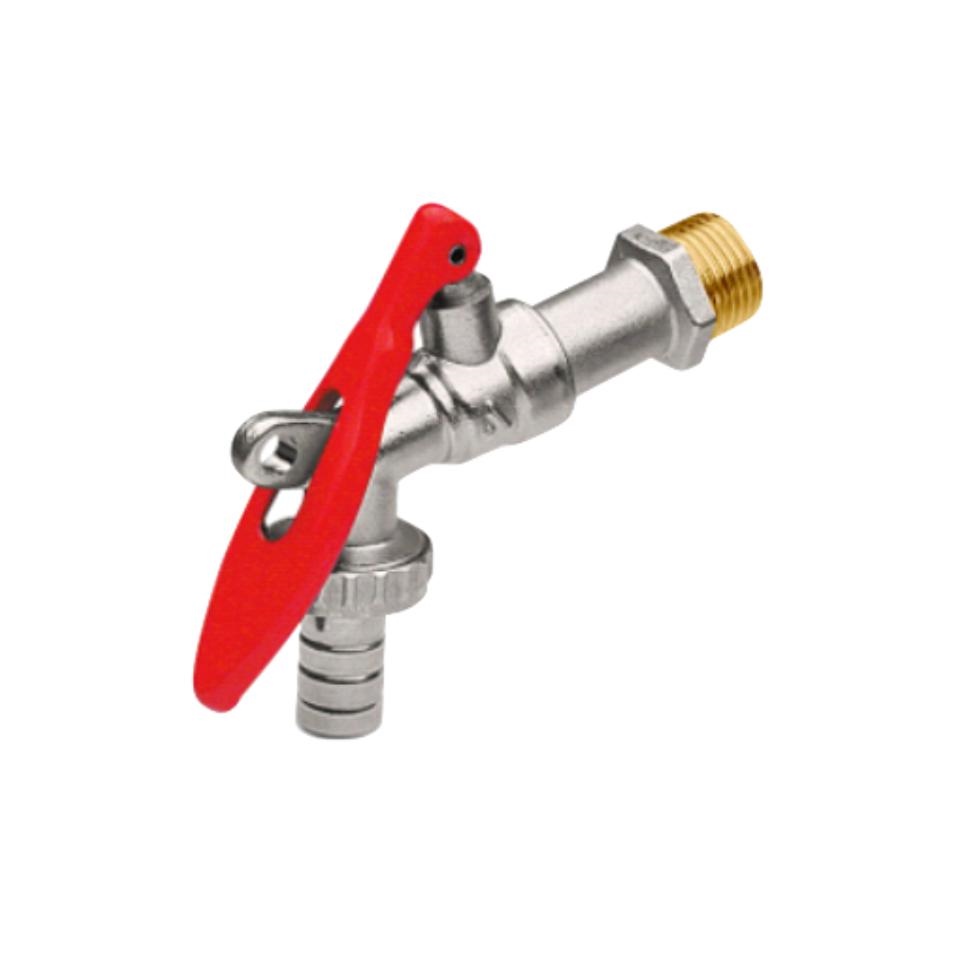 Rubinetto a sfera serie STAR con portagomma, tipo normale, in ottone nichelato. Leva in acciaio imbutita rossa sigillabile.