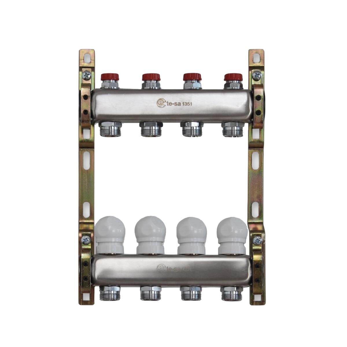 Collettore di distribuzione premontato composto da: collettore di mandata con detentori micrometrici di regolazione, collettore di ritorno con valvole di intercettazione termostatizzabili, supporti di fissaggio.