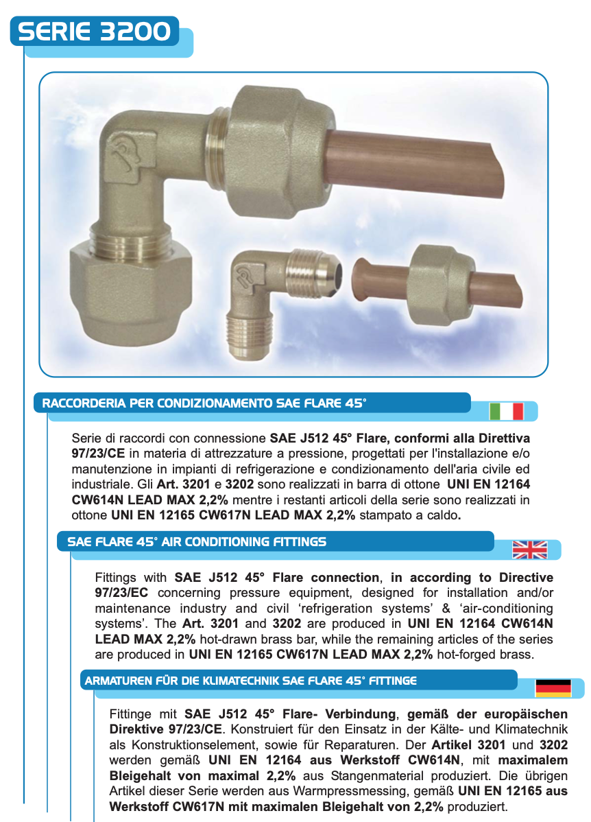 Serie di raccordi con connessione SAE J512 45° Flare,conformi alla direttiva 97/23/CE in materia di attrezzature a pressione, progettati per l’installazione e/o manutenzione impianti di refrigerazione e condizionamento